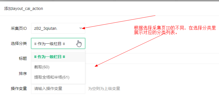 根据选择采集页ID的不同,在选择分类里展示对应的分类列表。