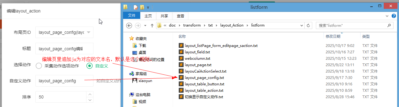 编辑页里追加js为对应的文本名,默认是这个规则。