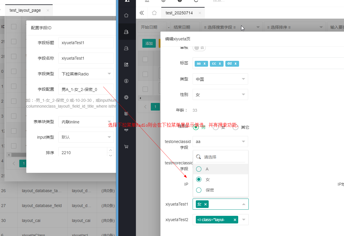 选择下拉菜单Radio则会在下拉菜单里显示单选,并有搜索功能,