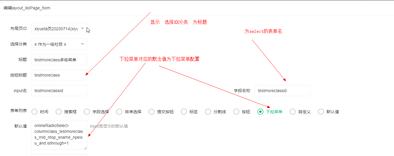 选择下拉菜单,在默认值里输出配置,如:onlineRadioSelect-columnclass_testmoreclass_mid_ntop_sname_npeixu_and isthrough=1