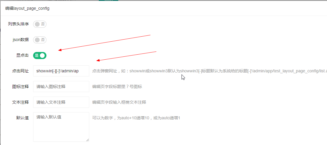 点击弹窗网址,如:showwin或showwin3默认为showwin3[-]标题默认为系统给的标题[-]'/admin/app/test_layout_page_config/list.asp?layout_page_id='+data.id [-]为分割,如果只有一条,则为网址,有两条则为标题+网址,有三条则为弹窗+标题+网址 标题里有*号为替换当前字段值的