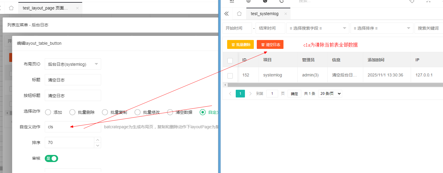 自定义动作:cls为清除当前表全部数据
